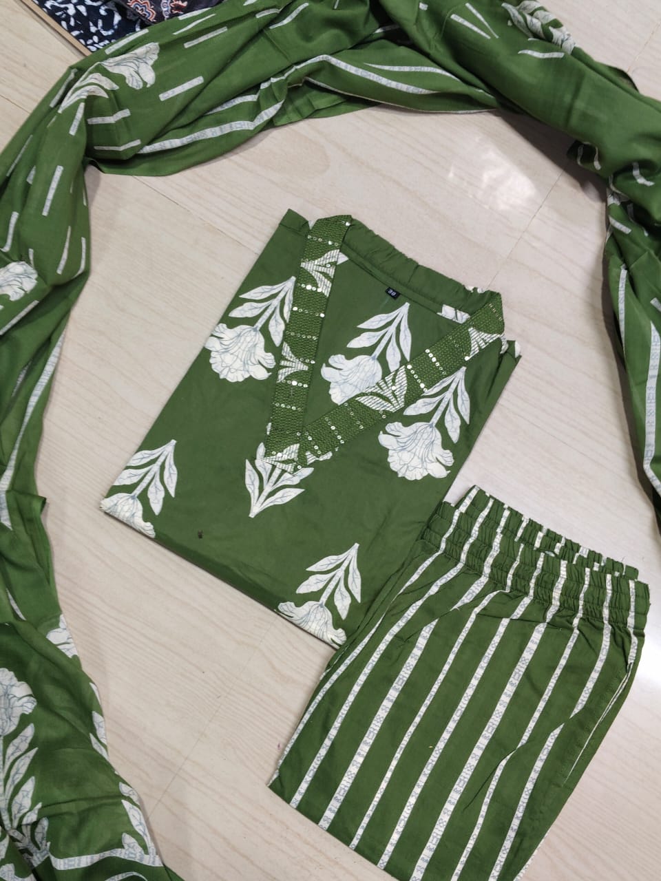 cotton kurti with pant and dupatta set is a classic and comfortable Indian ethnic outfit, perfect for daily wear, office wear, or casual outings—especially in warm weather. Here’s a breakdown of what typically comes in such a set: