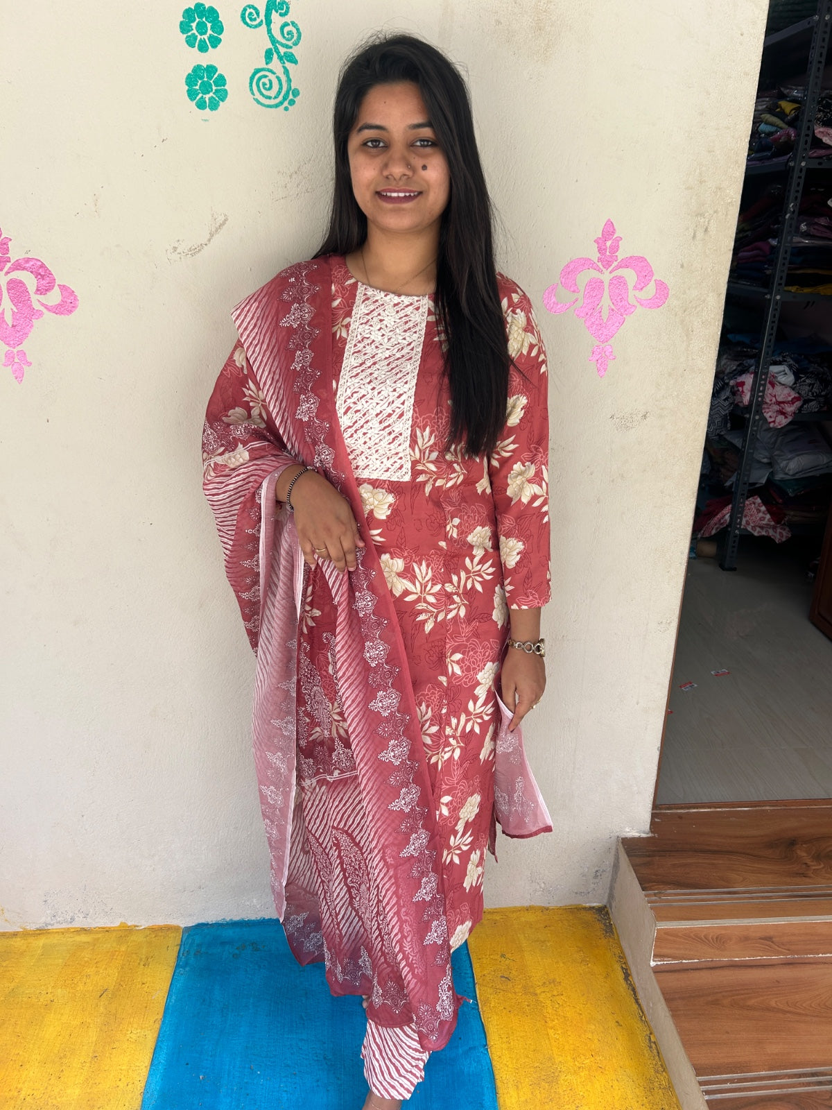 Rayon Kurti Set with Chest Patch Embroidery – With Pant & Dupatta 🌸