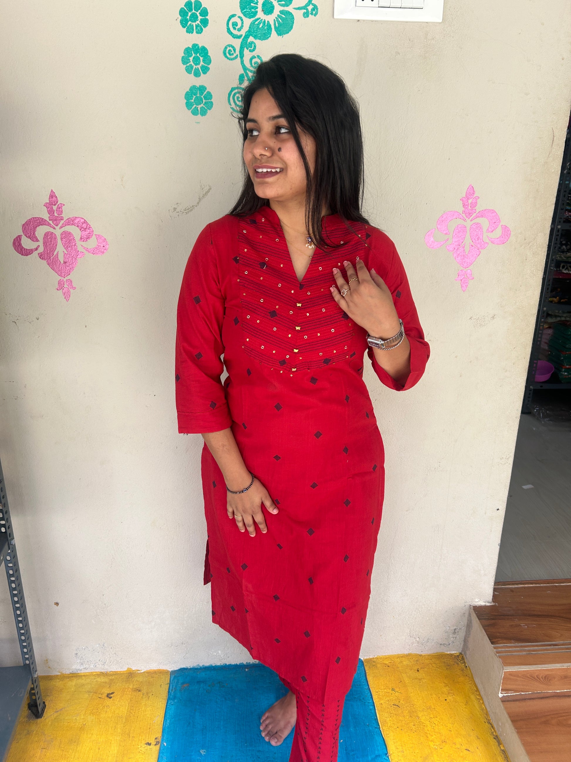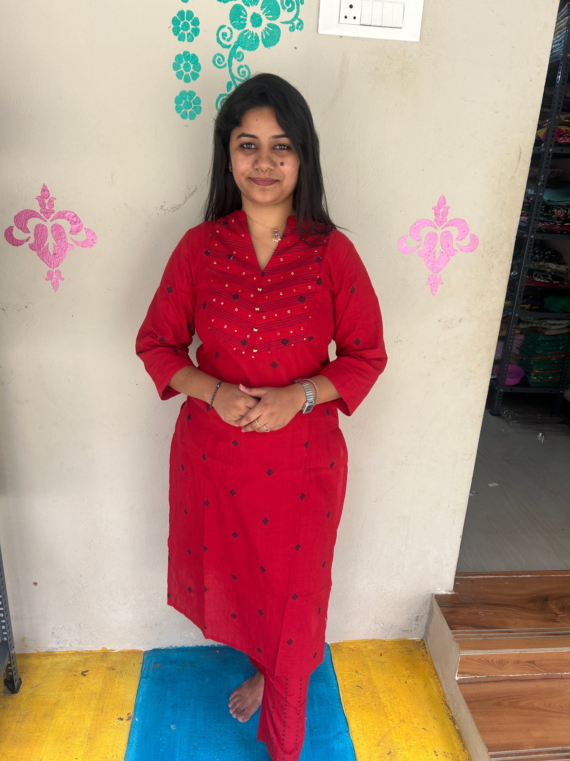 A cotton kurthi with pant is a comfortable and stylish ethnic outfit that pairs a cotton kurthi (kurta) with matching or contrasting pants. It's perfect for everyday wear, office, casual outings, or even semi-formal events depending on how you style it.