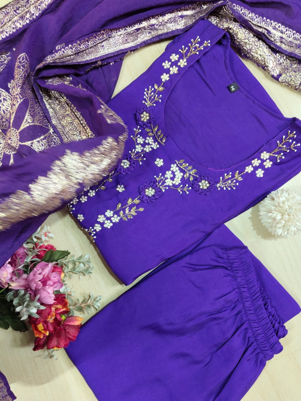 Made with luxurious silk and exquisite aari work, this kurti comes with a matching pant and dupatta set. .The added lining ensures a comfortable and stylish fit. Elevate your look with this elegant and versatile ensemble. Made with high-quality materials, it exudes elegance and sophistication. Elevate your look with this must-have piece for the holiday season.
