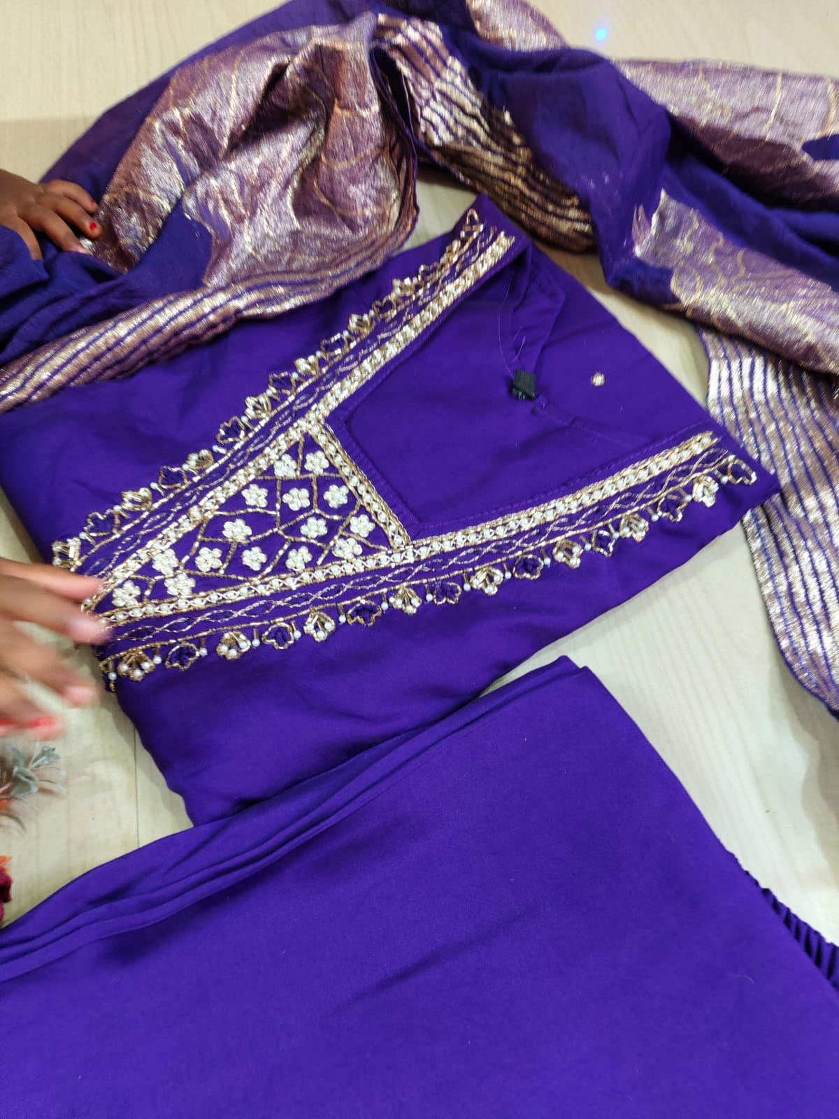 Made with luxurious silk and exquisite aari work, this kurti comes with a matching pant and dupatta set. .The added lining ensures a comfortable and stylish fit.Made with high-quality materials, it exudes elegance and sophistication.