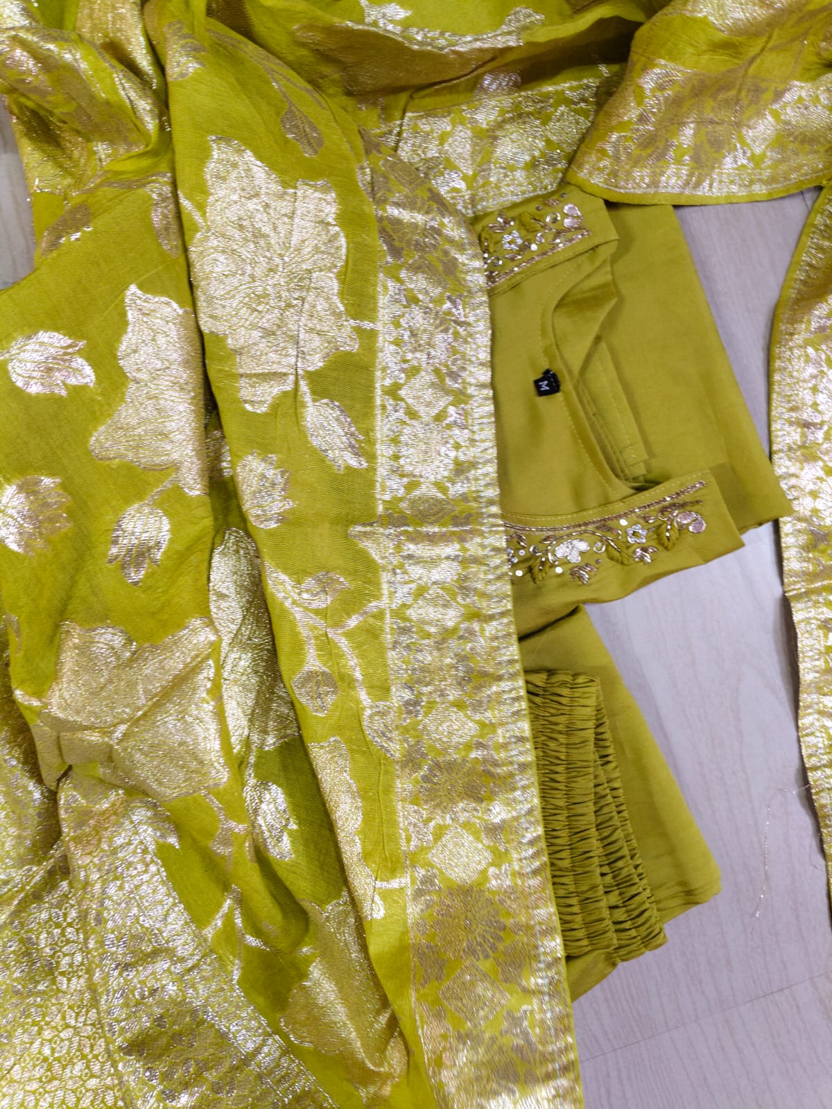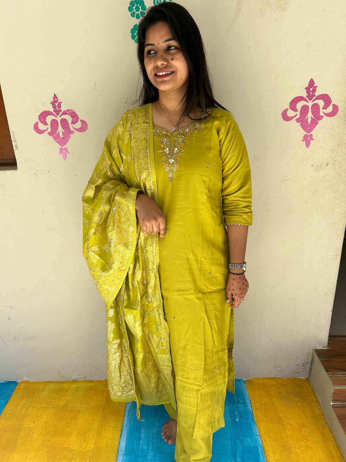 Made with luxurious silk and exquisite aari work, this kurti comes with a matching pant and dupatta set. .The added lining ensures a comfortable and stylish fit.Made with high-quality materials, it exudes elegance and sophistication.