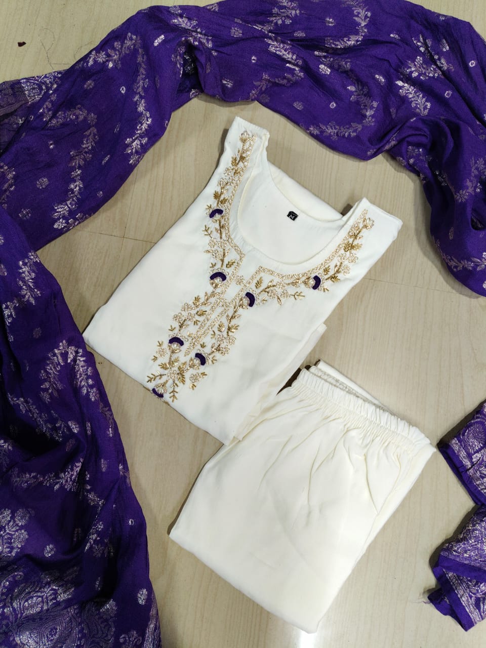 Ivory Kurti + Blush Pink Pant + Magenta Banarasi Dupatta