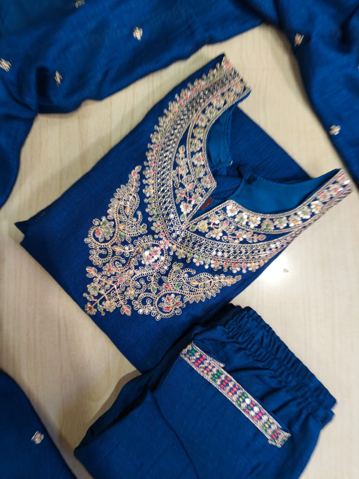 Peacock Blue Kurti + Mustard Pant + Rani Pink Dupatta