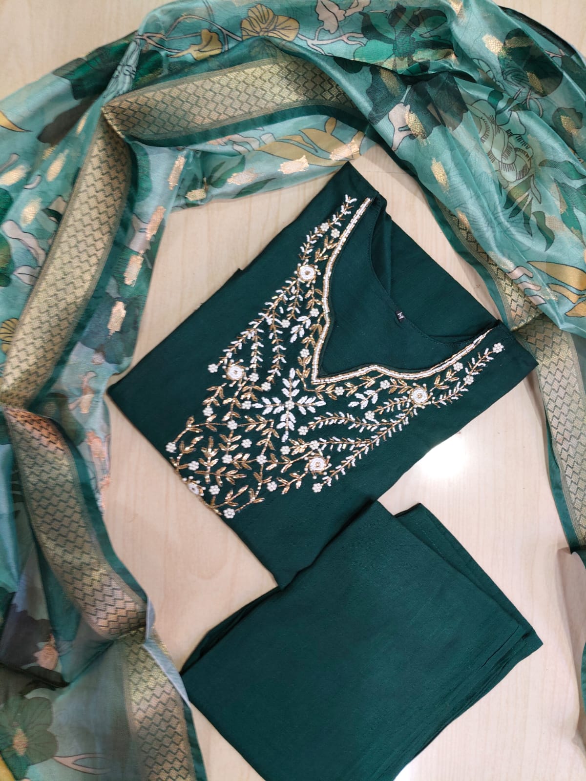 Emerald Green Kurti + Beige Pant + Red Banarasi Dupatta