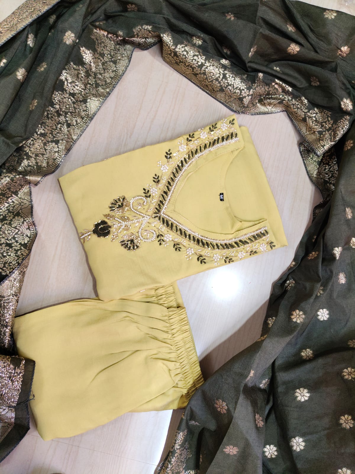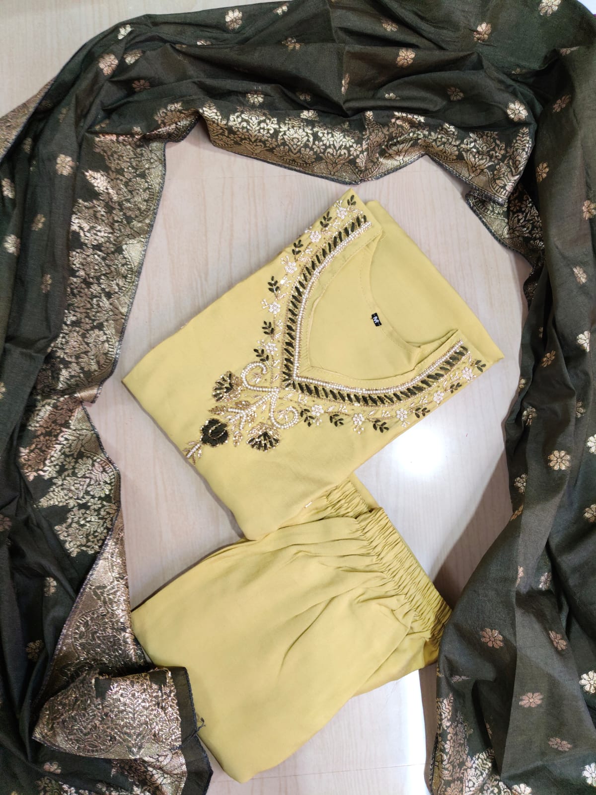Emerald Green Kurti + Beige Pant + Red Banarasi Dupatta
