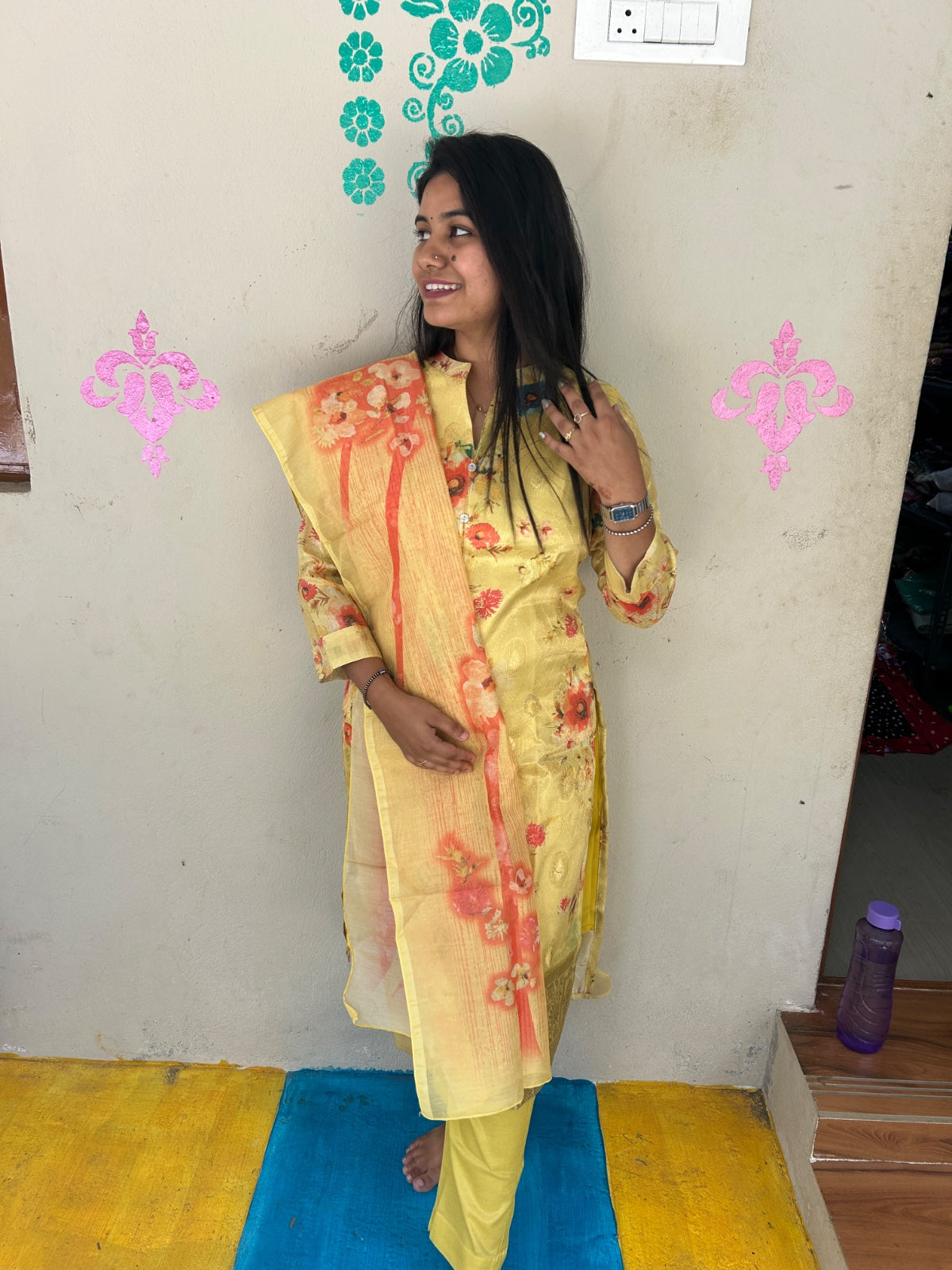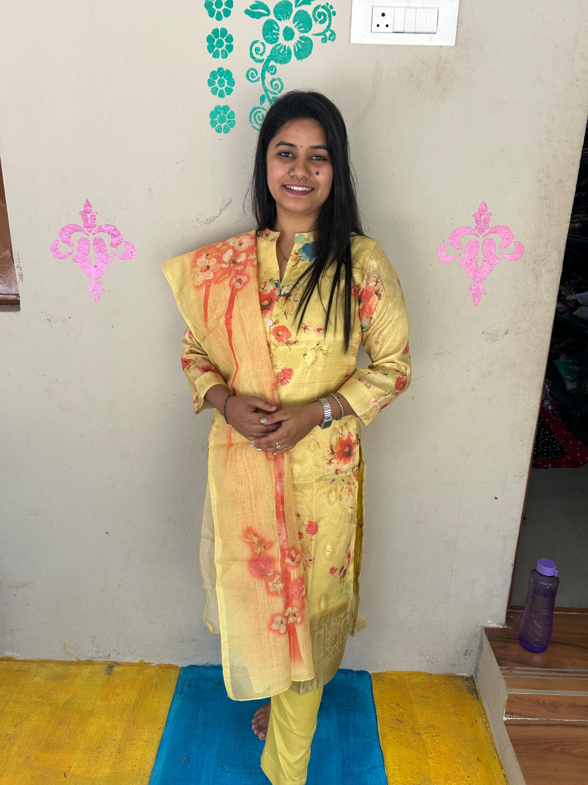 This Tissue Silk set includes a luxurious kurti, pant, and duppata, all made from high-quality tissue silk. The fabric's delicate and smooth texture provides a comfortable and breathable fit, making it perfect for any occasion. Elevate your wardrobe with this elegant and versatile set.